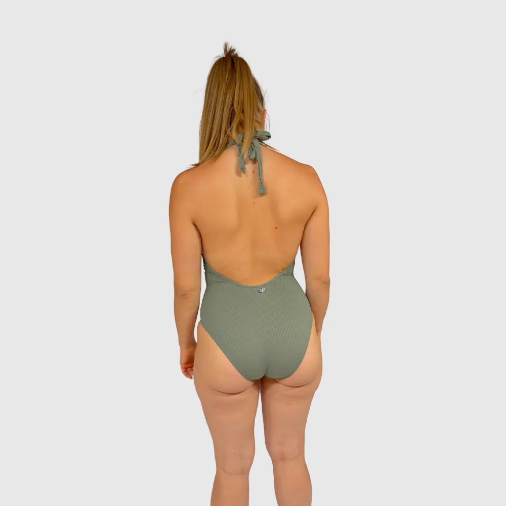 Maillot de bain 1 pièce kaki femme tissu gaufré gainant décolleté V maintien