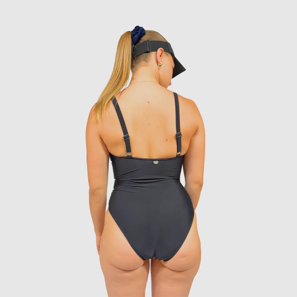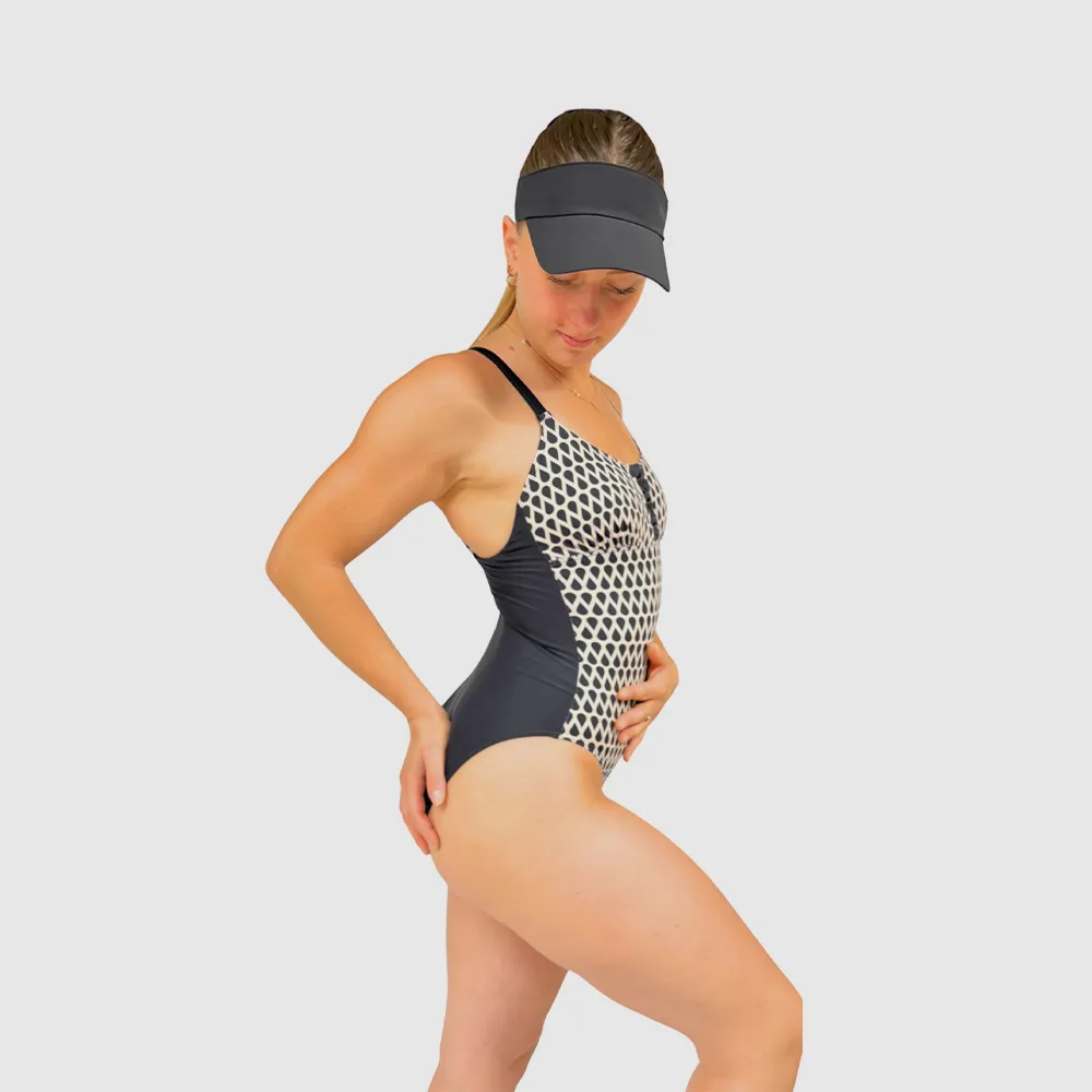 Maillot de bain 1 pièce noir et blanc femme gainant avec imprimé graphique et laçage