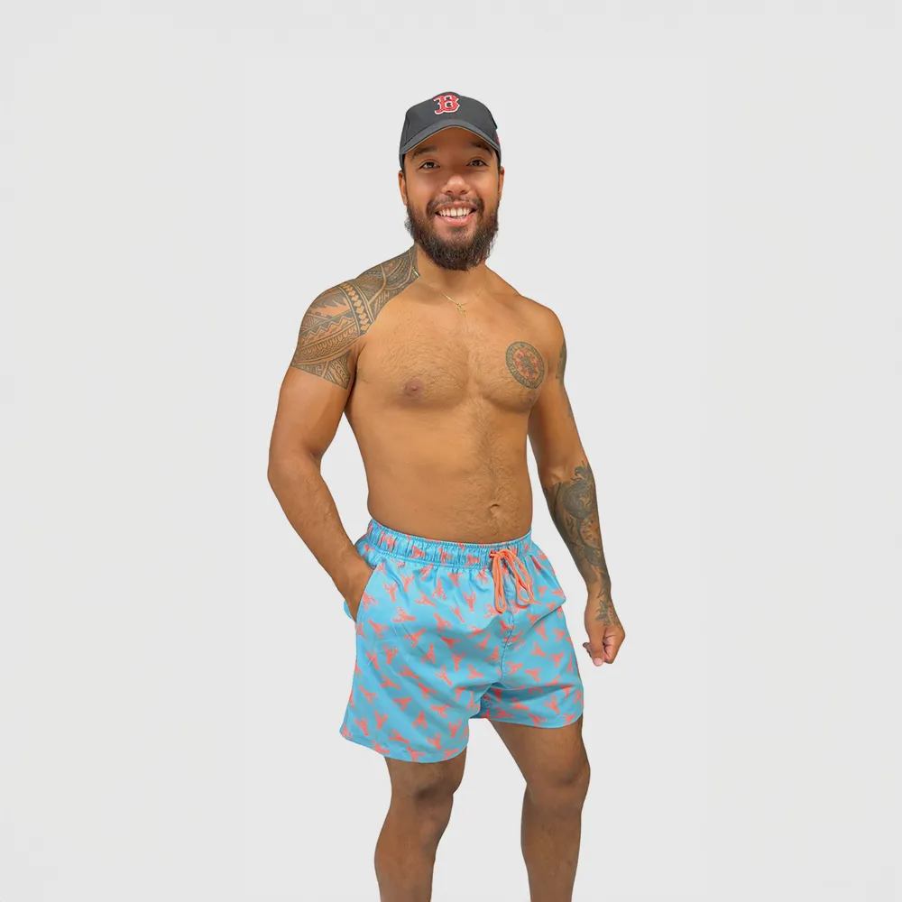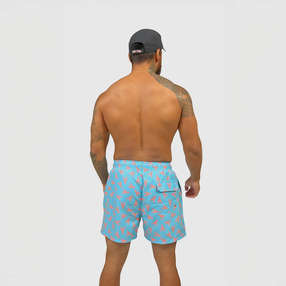 Short de bain homme bleu turquoise avec imprimé homards rouges – maillot de bain homme original été