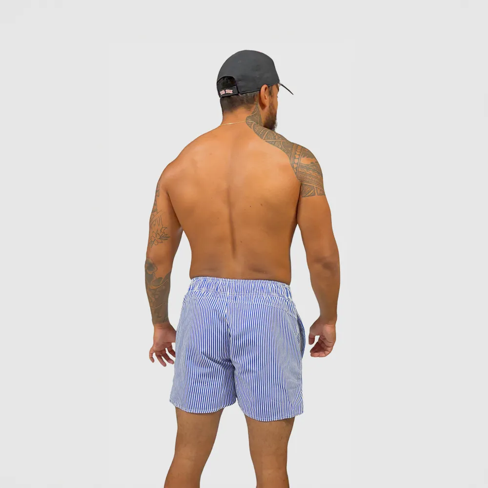 Short de bain homme rayé bleu et blanc avec cordon – maillot de bain homme style bord de mer