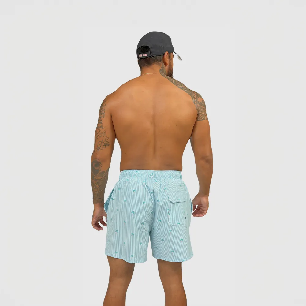 Short de bain homme vert d’eau rayé avec imprimé palmiers – maillot de bain homme style plage